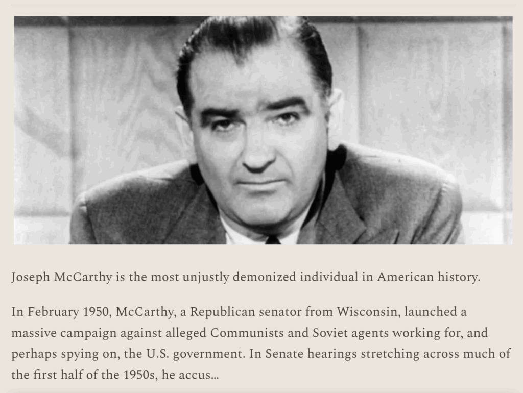 If you went to public school or watched a Hollywood movie made after 1970, you “know” this guy: Joseph McCarthy, the paranoid, witch-hunting senator who ruined lives with his conspiracy theories. At least that’s how they told it.